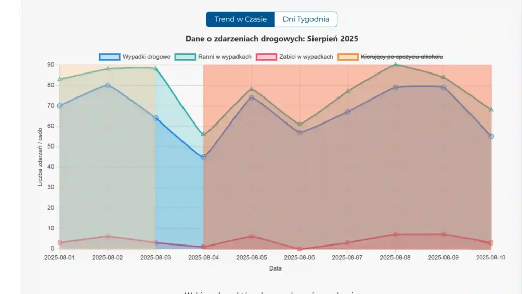 W naszej cyklicznej analizie bezpieczeństwa na polskich drogach kontynuujemy obserwację trendów wakacyjnych. Poprzedni tydzień, na przełomie lipca i sierpnia, przyniósł falę optymizmu dzięki wyraźnym spadkom we wszystkich kluczowych wskaźnikach. Dane z pierwszego pełnego tygodnia sierpnia (04.08 – 10.08) podtrzymują częściowo ten pozytywny obraz, zwłaszcza w kontekście ogólnej liczby zdarzeń i osób rannych. Niestety, radość mącą niepokojące sygnały – po raz pierwszy od trzech tygodni odnotowaliśmy niewielki wzrost liczby ofiar śmiertelnych i zatrzymanych nietrzeźwych kierowców.